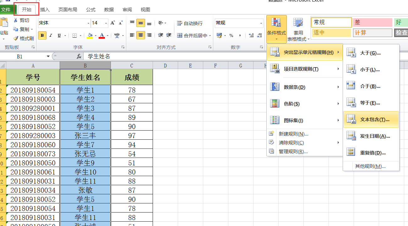 第二种方法:选中“学生姓名”这一列,在开始选项下,选择条件格式——突出显示单元格规则——文本包含。