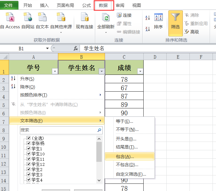 第一种方法:将鼠标放在第表头位置,选择数据选项下的筛选,在表头单元格右下角的下拉框中,选择文本筛选——包含
