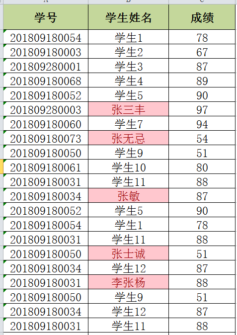 最终效果如下,所有包含“张”的学生信息就被标记了粉色。