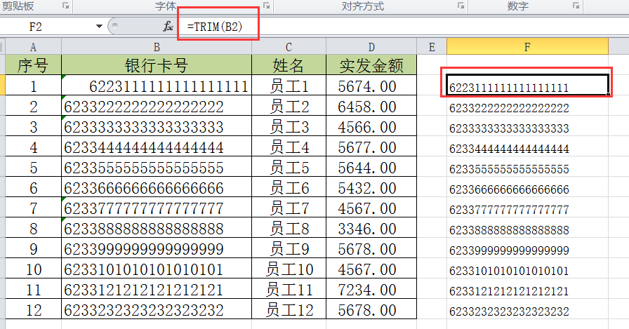 以下表为例,为了明显起见,在银行卡号一列的单元格B2最左边添加了3个空格。Excel怎么快速去掉潜在的空格隐患呢?一步就够了。