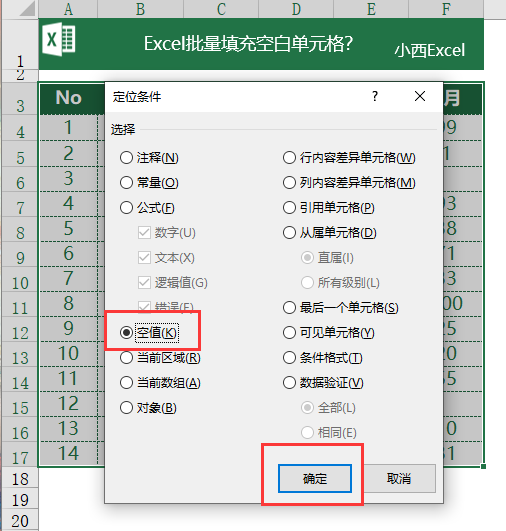3、在弹出的定位条件窗格中勾选【空值】,点击【确定】