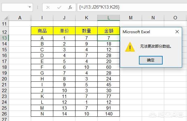 对于数组公式而言,如果涉及到多个单元格输入数组公式的情况,删除其中一个单元格公式或者某一部分公式,Excel是不允许直接进行删除的,删除时会提示“无法更改部分数组”