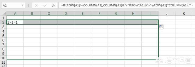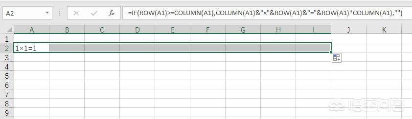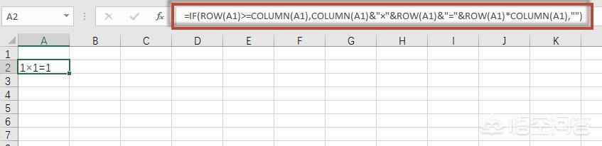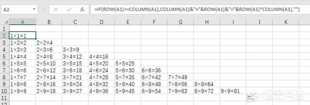1、打开EXCEL,在A2单元格中输入公式=IF(ROW(A1)>=COLUMN(A1),COLUMN(A1)&”×”&ROW(A1)&”=”&ROW(A1)*COLUMN(A1),””);
