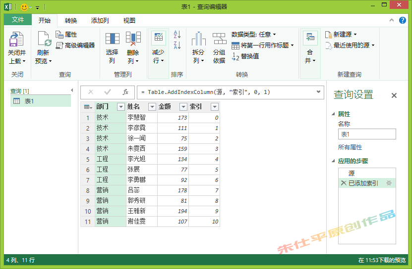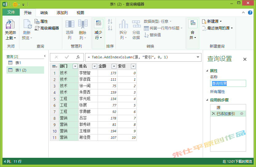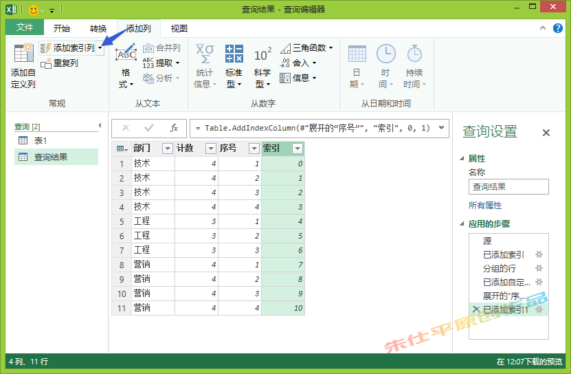 Step 6:为了便于查询结果的准确性,在”查询结果“表中,使用[添加列]功能,添加一个索引列。