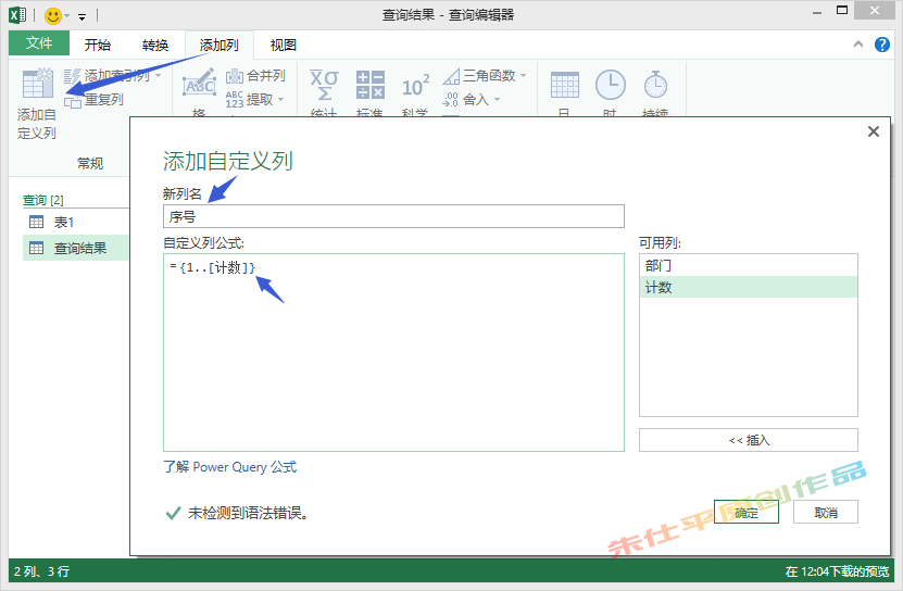 Step 5:点击[添加列]选项卡→[添加自定义列],设置公式 ={1..[计数]},点击确定按钮后,在查询结果”序号“字段点击展开按钮,展开这个字段。