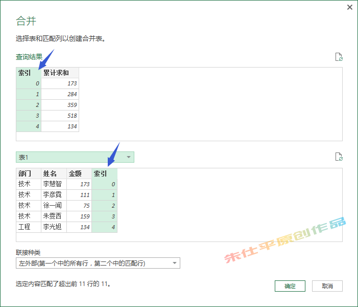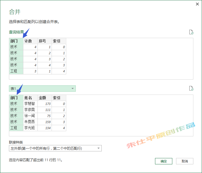 Step 11:继续使用合并查询将[表1]的内容与查询结果匹配在一起, 点击[开始]选项卡→[合并查询],对话框中做如下设置。
