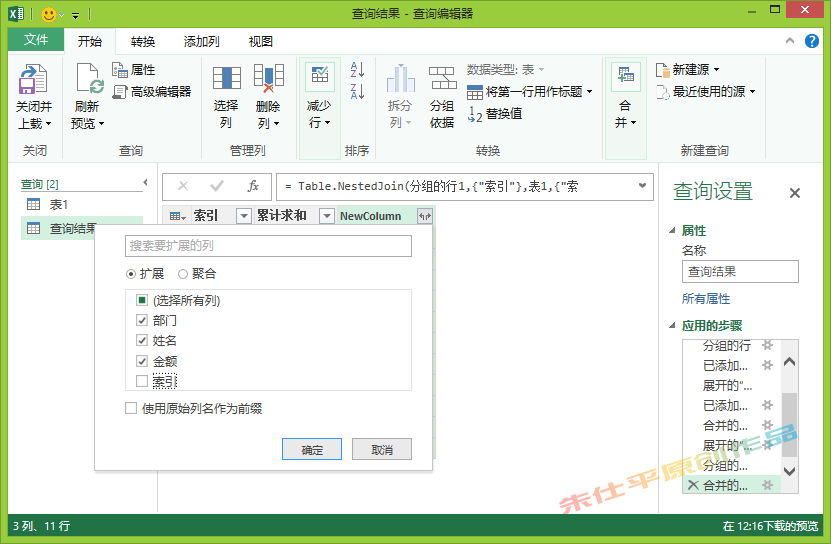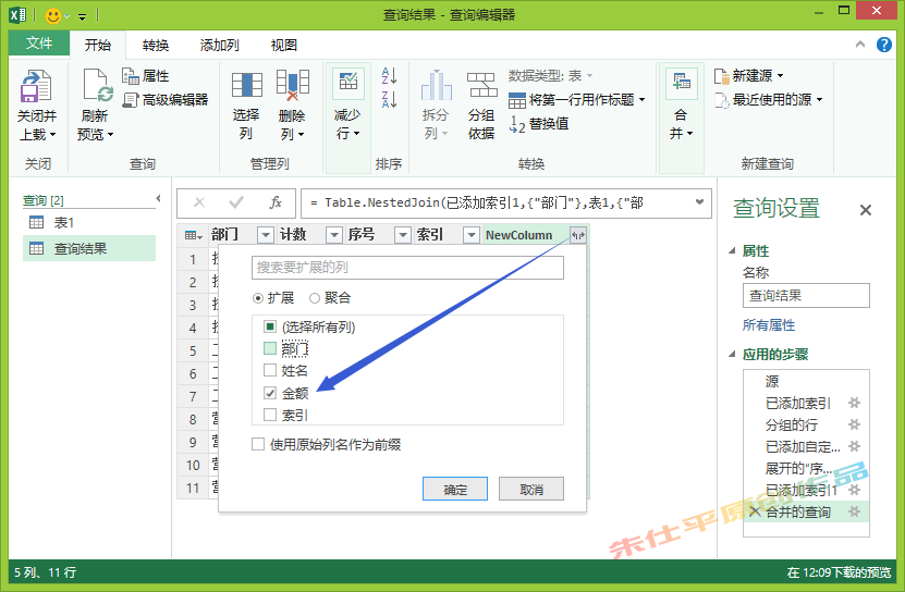 Step 12:展开NewColumn,只保留”部门“,”姓名“,”金额“三列