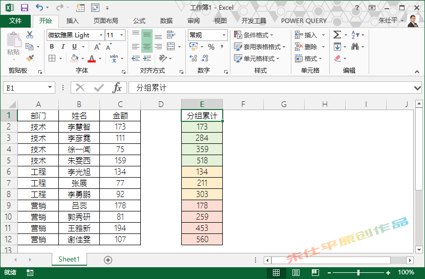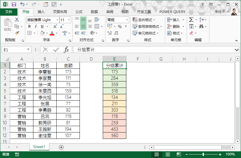 先看图,说一下需求,表格中,ABC三列是原始数据, 需要动态统计出每个部门的分组累计和(如E列结果所示)。