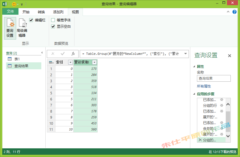 = Table.Group(#”展开的“NewColumn””, {“索引”}, {“累计求和”, each List.Sum(List.FirstN([金额],List.First([序号])))})