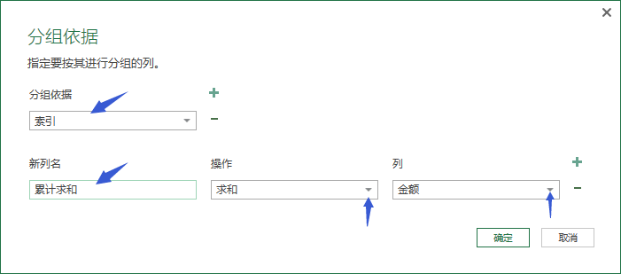 = Table.Group(#”展开的“NewColumn””, {“索引”}, {{“累计求和”, each List.Sum([金额]), type number}})