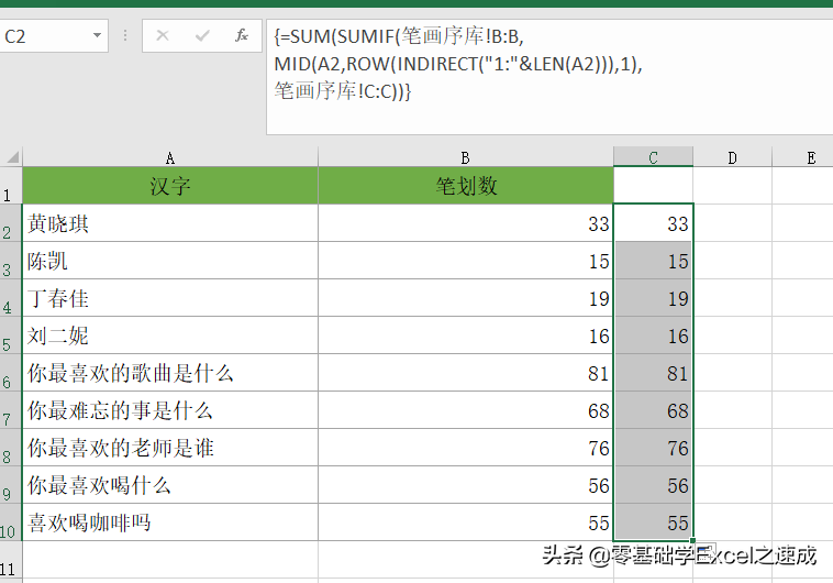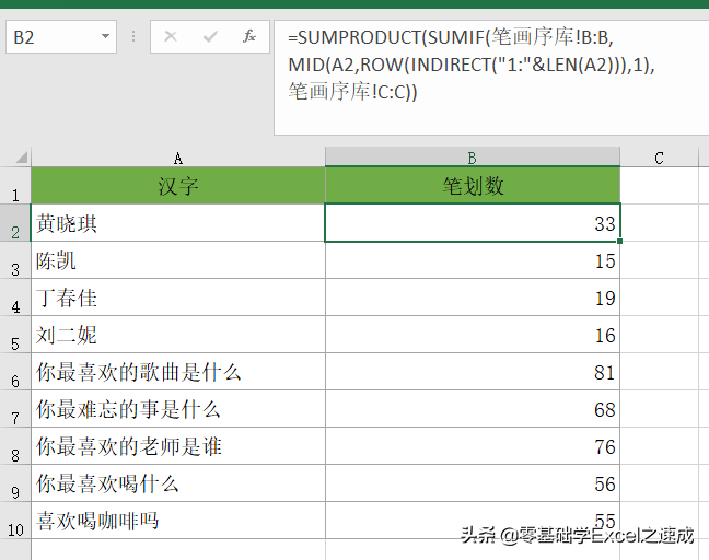 =SUMPRODUCT(SUMIF(笔画序库!B:B,MID(A2,ROW(INDIRECT(“1:”&LEN(A2))),1),笔画序库!C:C))