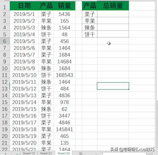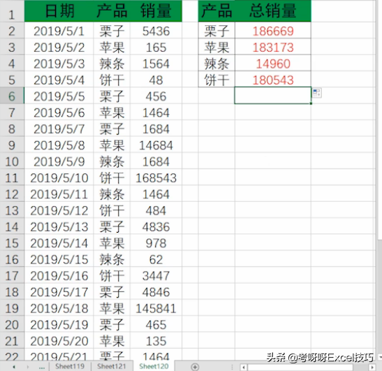 看的很晦涩?别急,我们来实际操作一番。如图,我们需要分别求出栗子、苹果、辣条、饼干的总销量。