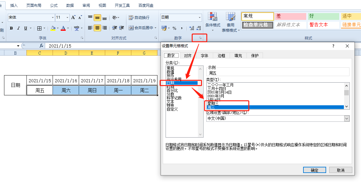 Excel本身也对日期数据定义了许多种常用的格式,按照上图直接选择格式也能完成日期转换为星期几。