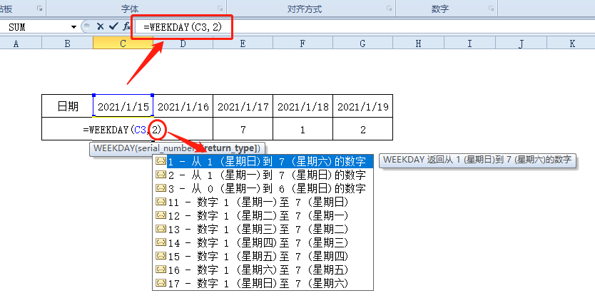 有时候你可能需要数字格式的星期,如1,2,3,4,5,6,7对应周一到周日。那么weekday函数可以满足你的需求。