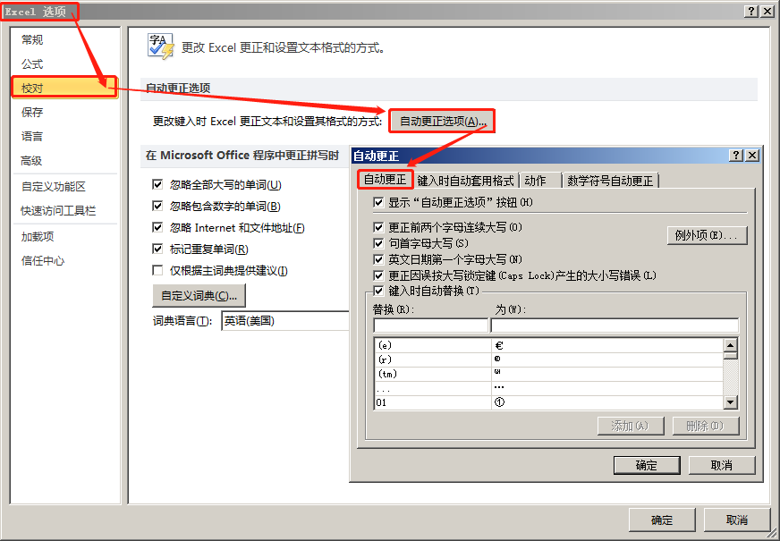 Excel的自动更正位置,打开方式:Excel选项→校对→自动更正选项(A),即可打开自动更正对话框。