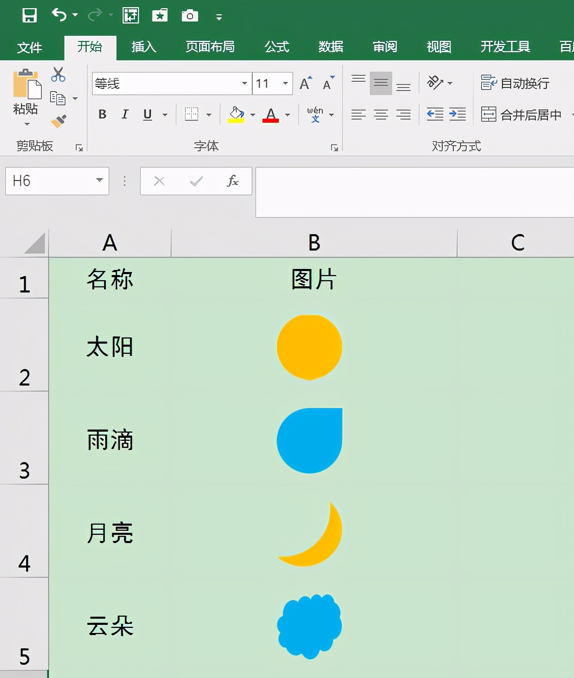 3.同时按Ctrl+A全选文本文档中的代码,再复制粘贴回Excel工作表的B2:B5单元格中,这时B2:B5单元格中就会显示出图片了,并且图片与同行A列中的名称会自动对应好。