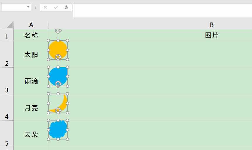 下图工作表A列中的名称顺序已固定,接下来我们想在工作表B列中批量插入与A列名称相对应的图片,图片的顺序自动与A列中的名称顺序相匹配。