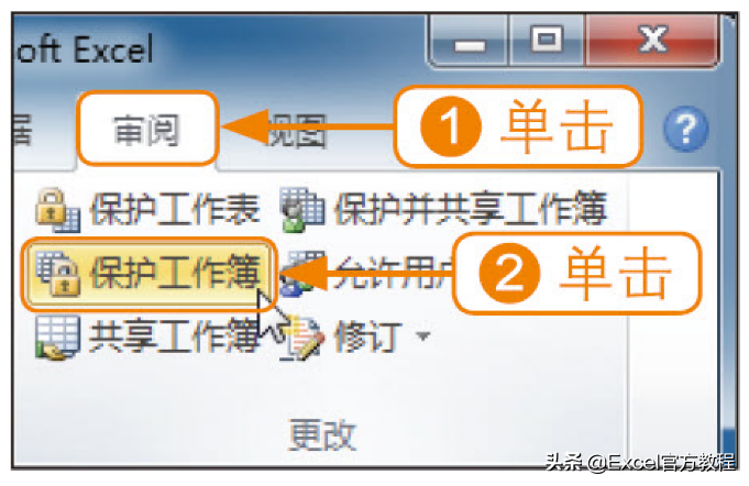 ②在“更改”工具组中单击“保护工作簿”按钮,如下图所示。