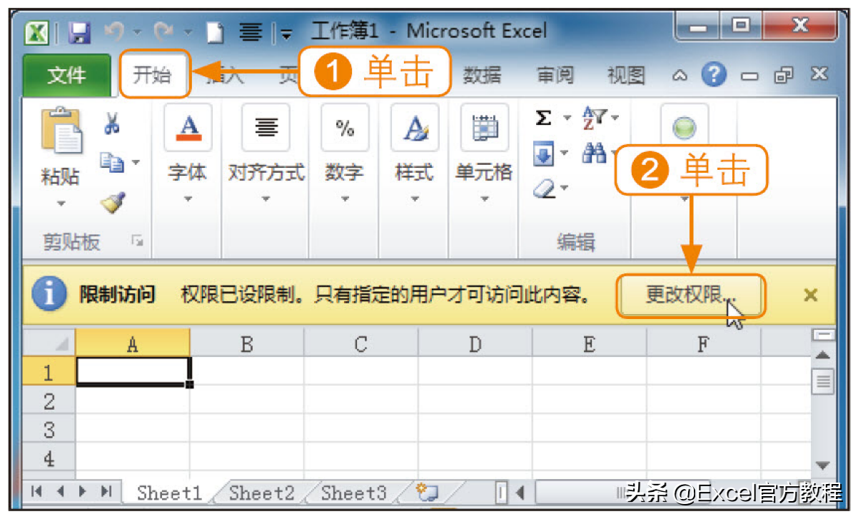 ②在编辑区的位置上会显示“限制访问”的提示,单击“更改权限”按钮,如下图所示。
