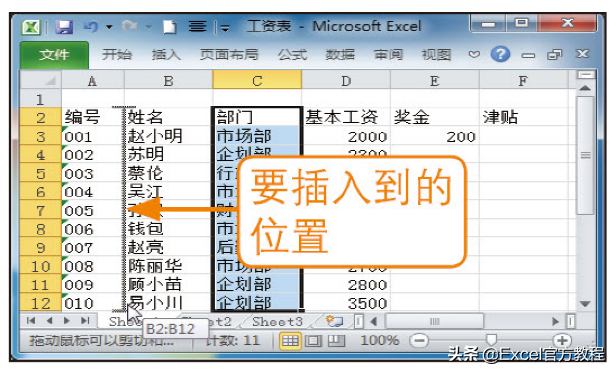 按住鼠标左键并按住【Shift】键拖动单元格到目标区域,此时会出现一个插入形状(按行方式插入)或(按列方式插入),如下图所示,然后松开鼠标左键,再松开【Shift】键即可实现单元格内容的插入,如下图二所示。