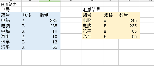 有个BOM,我需要把名称和规格相同的数量汇总起来怎么做?