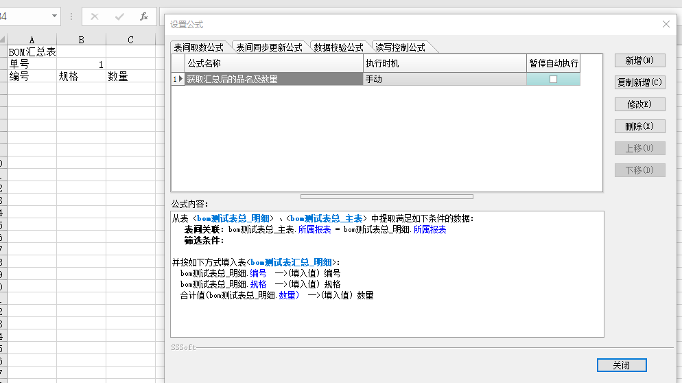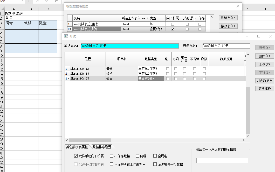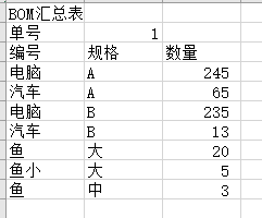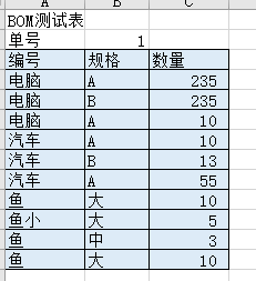 先建立一个模板(表)录入数据,这个模板【bom测试表】负责数据收录,主表就一个字段【单号】,明细表有【编号】【规格】【数量】三个字段