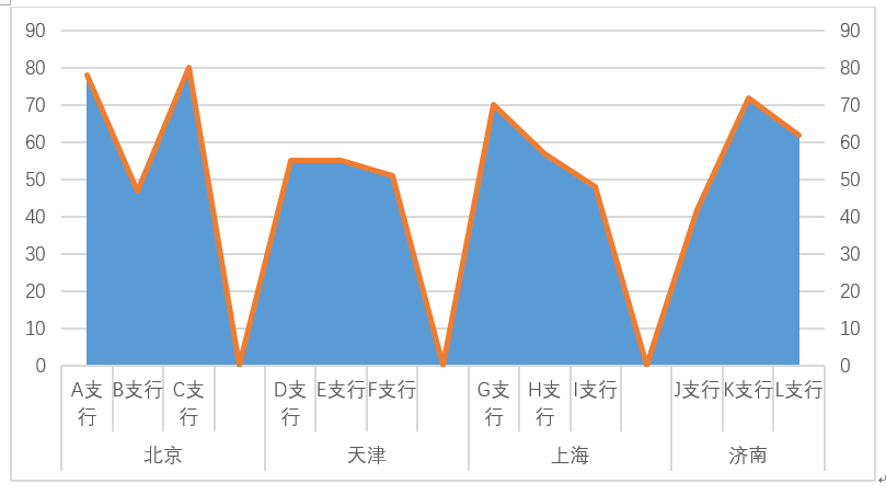 Step3:去除空值。此时的图表最大的问题在于连接在一起,而我们的目的是让每个地区能够分开。此时先选中图表——右键——选择数据——隐藏的单元格和空单元格(H),空单元格显示设置为:空距,点击确定,结果如图。