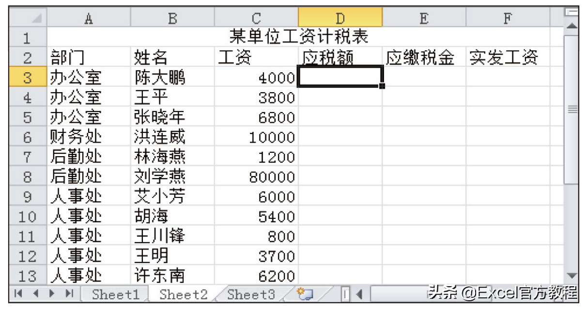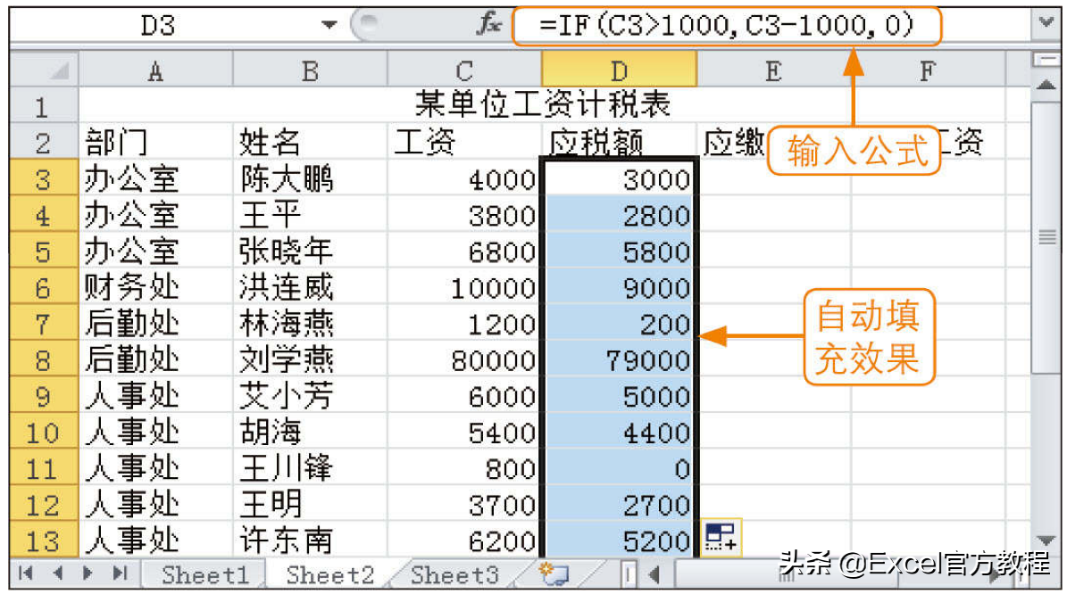 根据前面的分析,应税额只计工资大于1000元的部分,此处用一个IF函数。