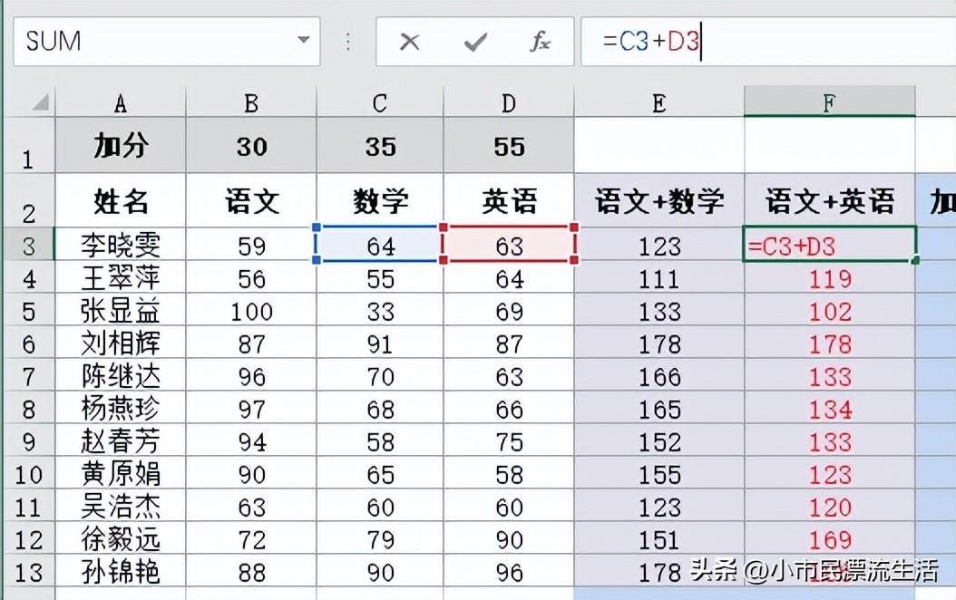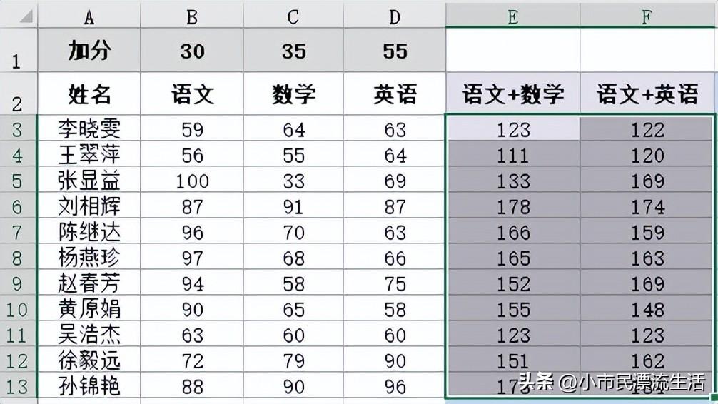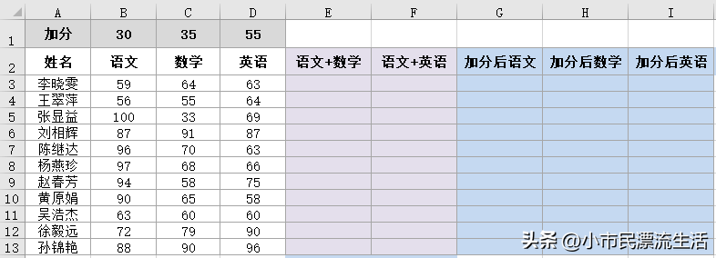 如下案例求出每位同学,语文 数学和语文 英语的成绩,以及语数外3科加分后的成绩。