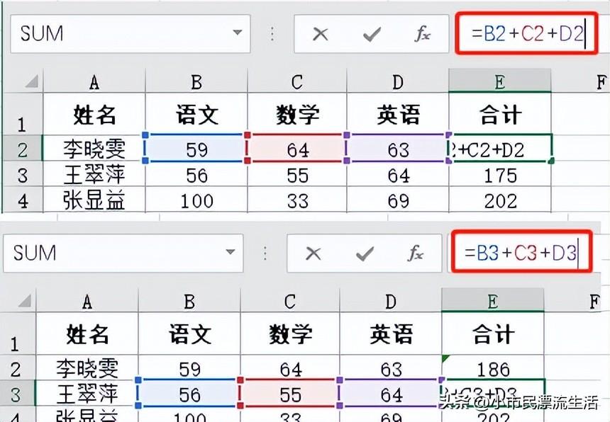 首先在E2单元格输入公式=B2 C2 C2,然后选中E2单元格鼠标移动单元格右下角待光标变成* *时,按住鼠标左键向下填充至E12单元格,填充的公式里的行号和列号会随着单元格的改变而改变,这就是相对引用。如第E2单元格公式为=B2 C2 D2,E3单元格相应变成了这一行的值=B3 C3 D3以此类推….。此方式也是使用Excel表格办公时经常性用到的。