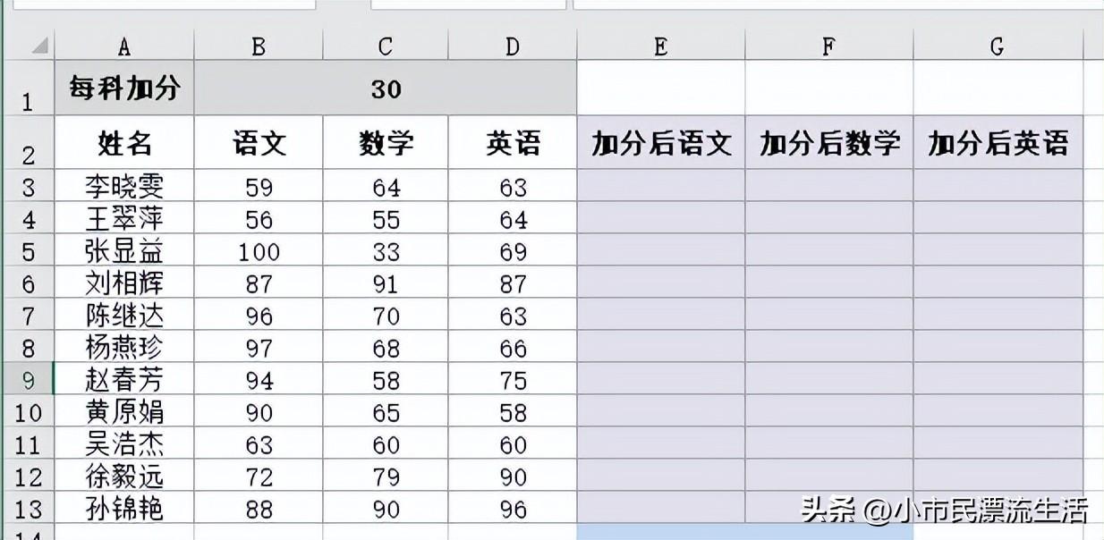 在E3单元格输入公式=B3 $B$1,拖动鼠标向右、向下填充至E3:G13区域。