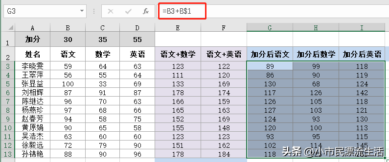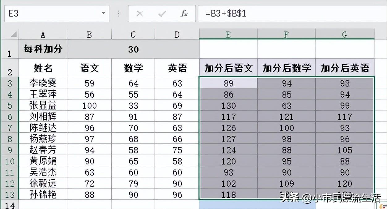 在将E3单元格公式=B3 $B$1复制到E3:G13区域中其他单元格时,$B$1单元格行和列都是不变的,只有B3单元格相对更改。
