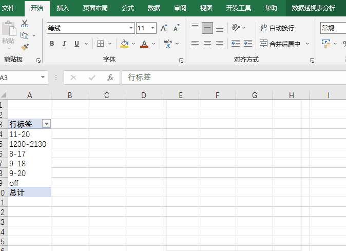 我们先点击数据透视表区域的任意单元格,进入数据透视表分析窗口,即上方功能区显示为“数据透视表分析”的内容选项。