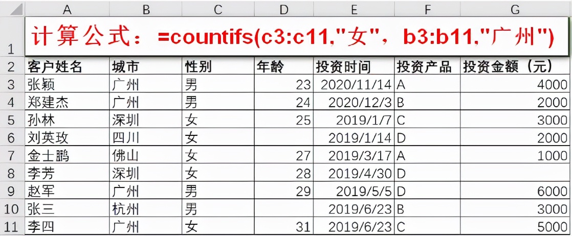 计算公式:=countifs(c3:c11,”女”,b3:b11,”广州”)