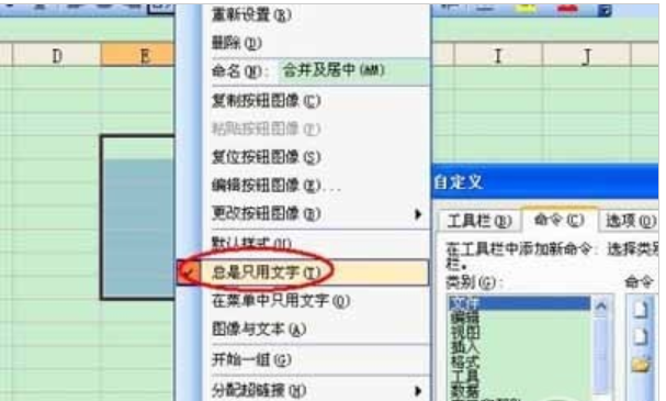 1、单击菜单:工具—自定义“然后选中”合并及居中“按钮单击右键选择”总是使用文字”退出自定义,按ALT M就是合并及居中的快捷键了,也可以在命名框中输入你要的快捷捷如(&A)。