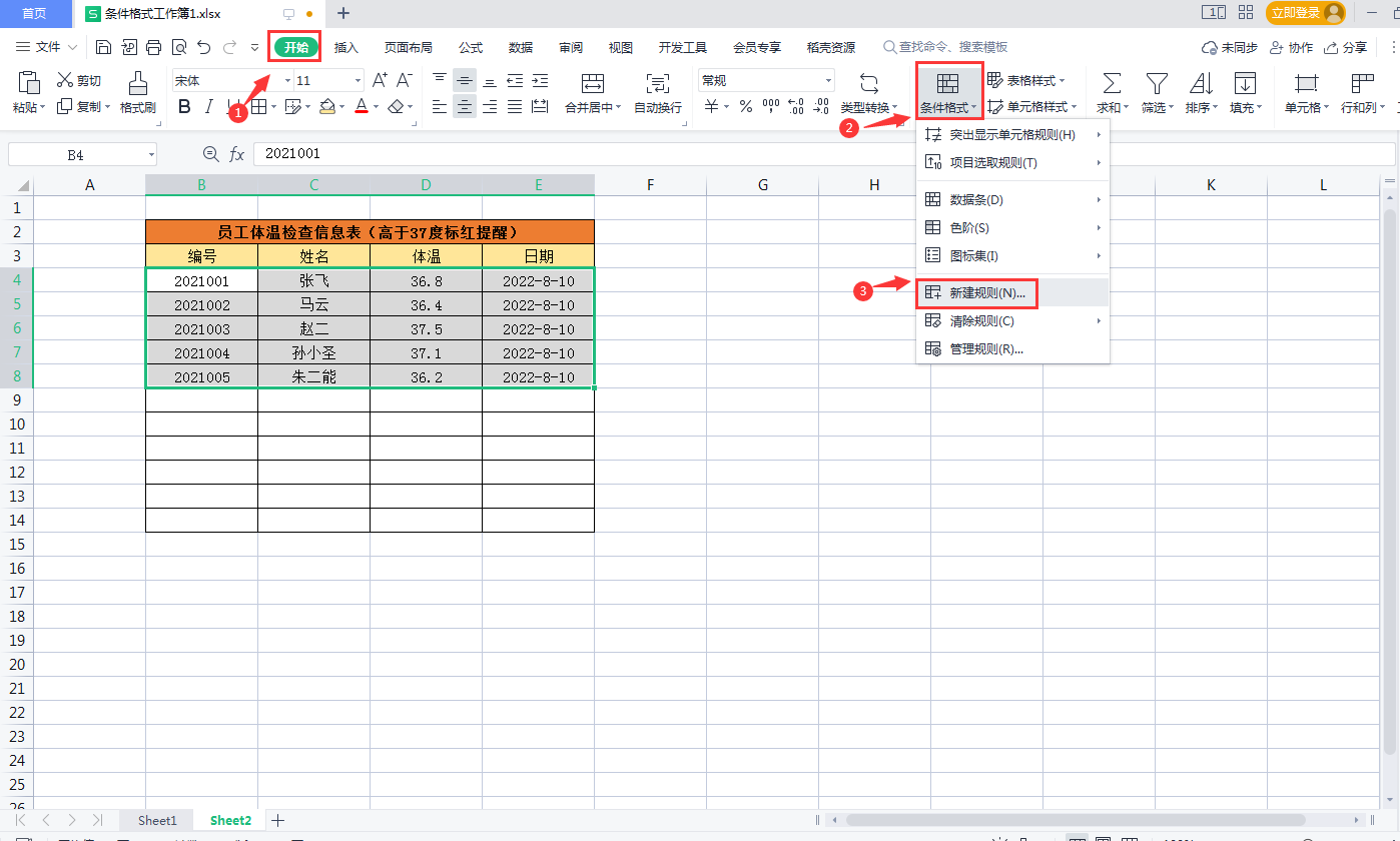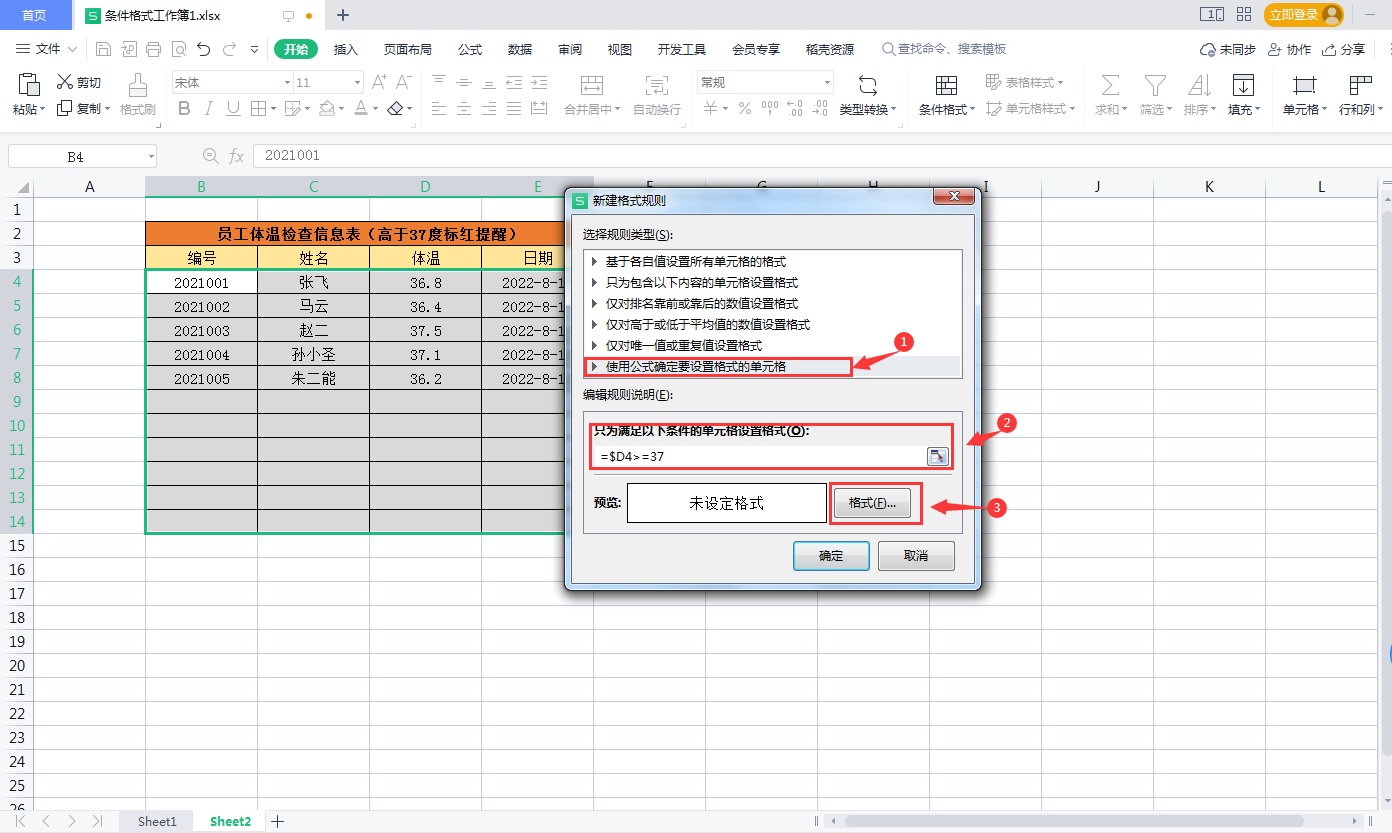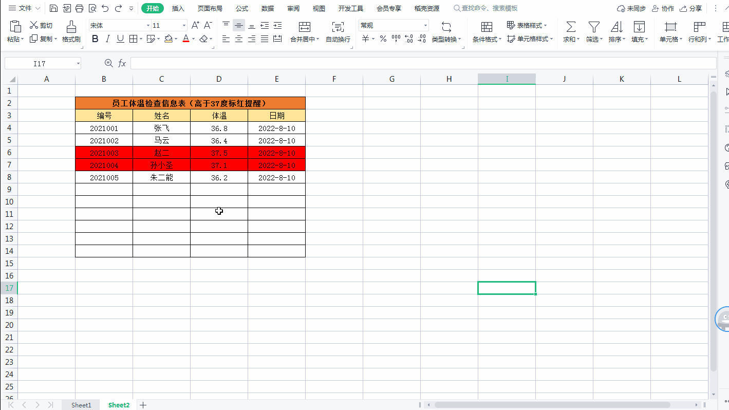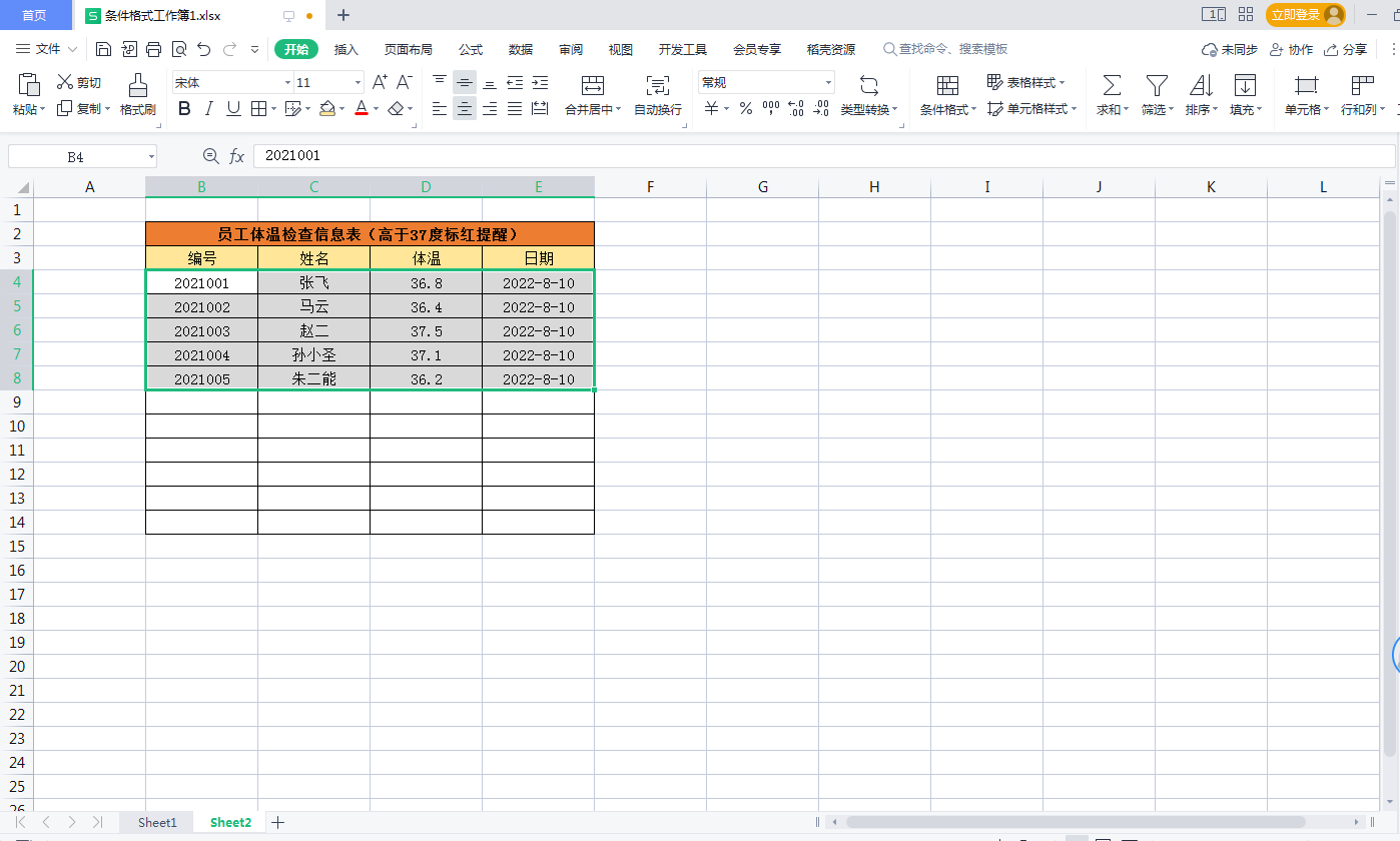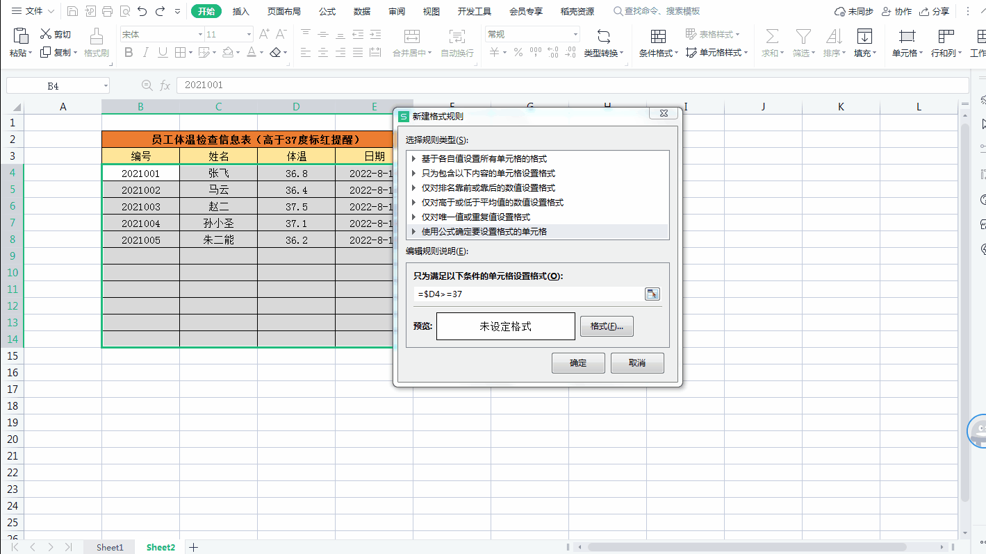 二、体温高于37度,整行标红自动填充颜色
