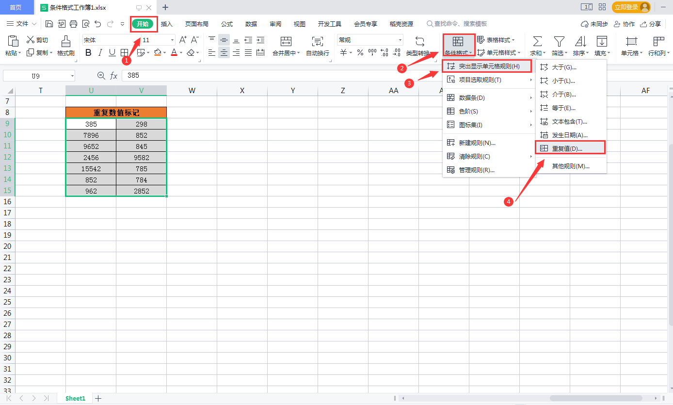 2、点击【开始】-【条件格式】-【突出显示单元格规则】选择【重复值】,如下图所示
