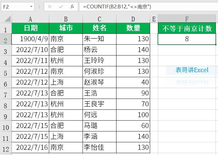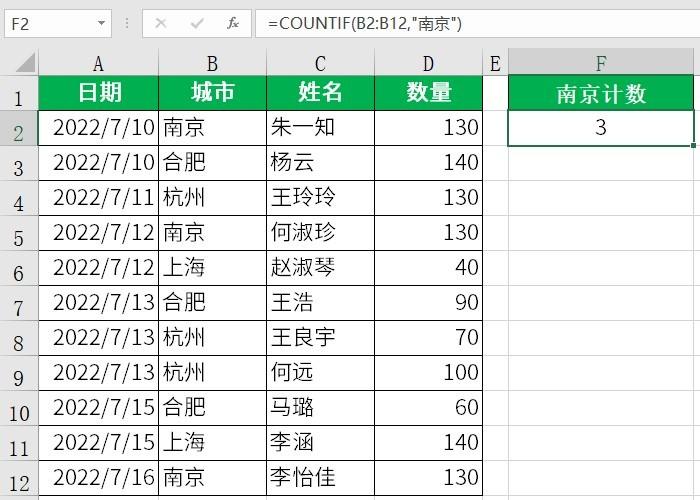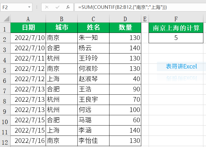 =SUM(COUNTIF(B2:B12,{“南京”;”上海”}))