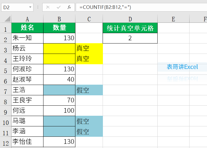 =COUNTIF(B2:B12,””)-COUNTIF(B2:B12,”=”)