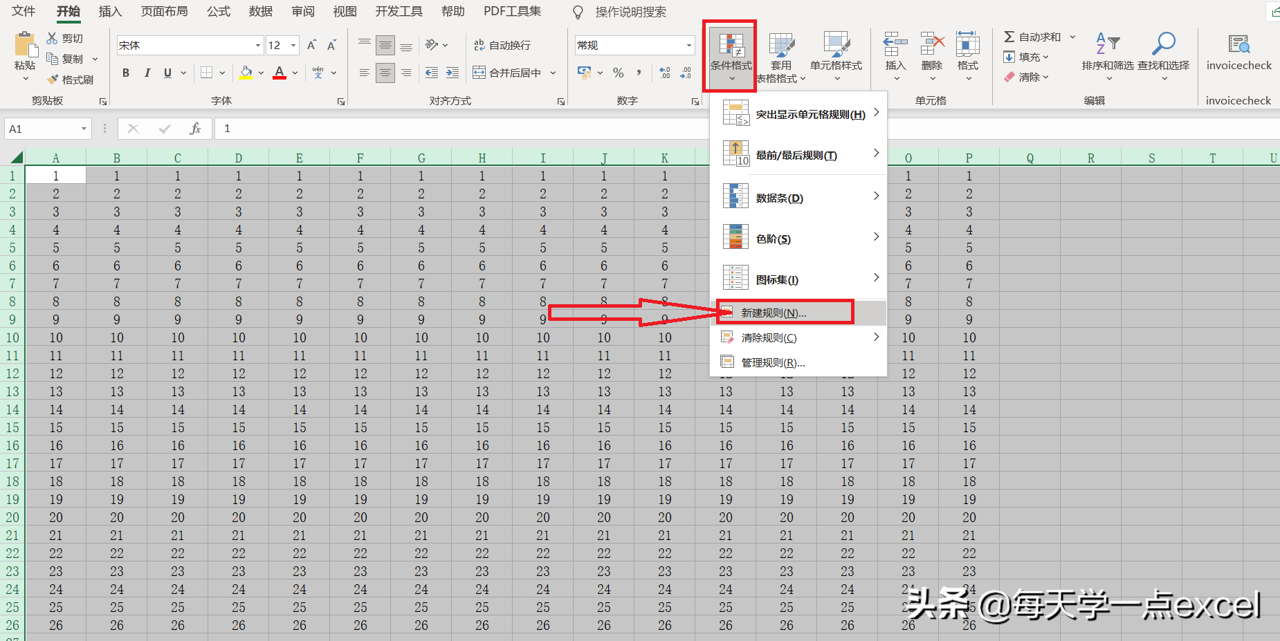 菜单栏中选择开始,点击中间位置的条件格式,弹出的设置选项中点击新建规则。