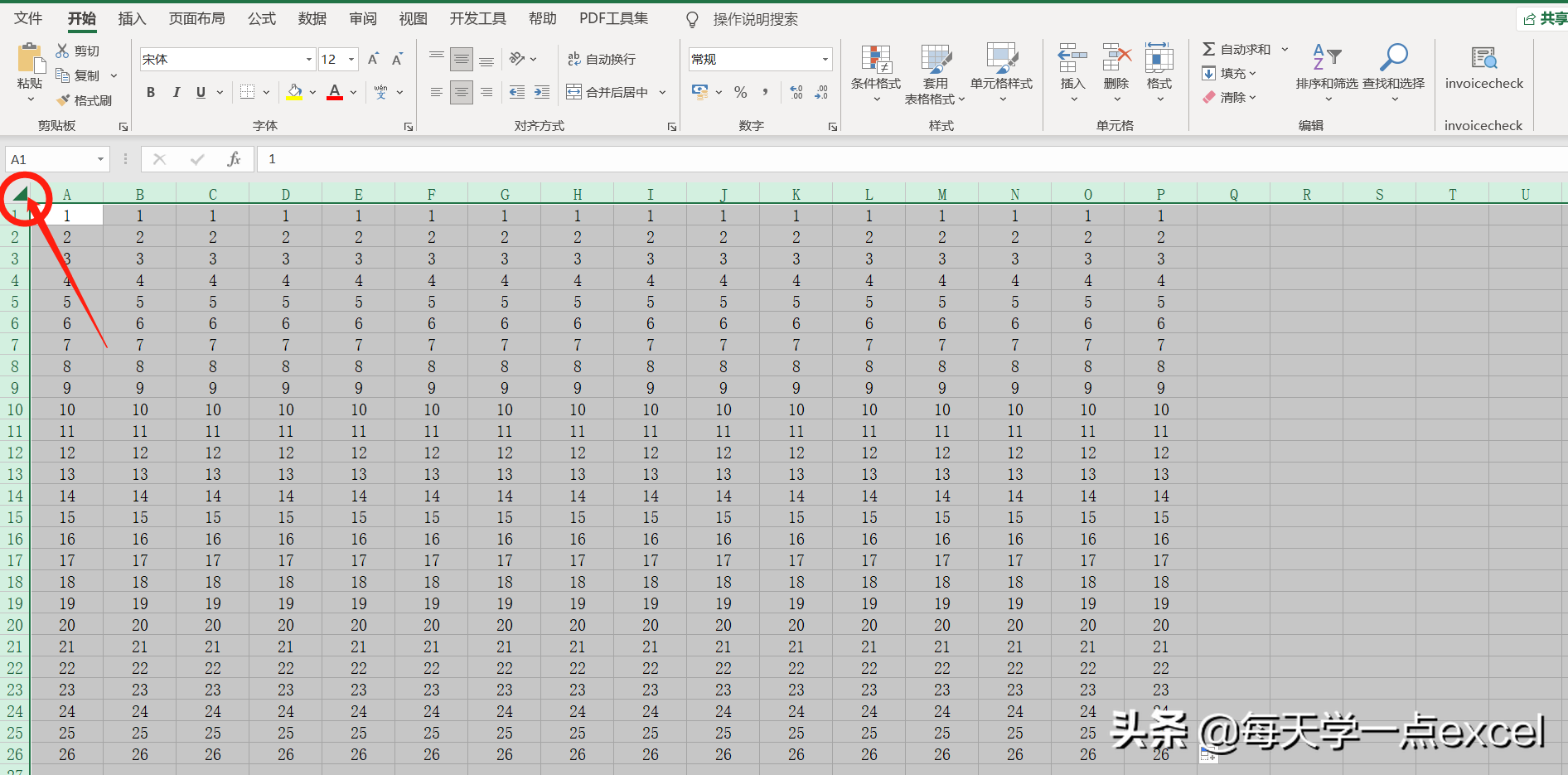 鼠标点击工作表的左上角位置可以选中整个工作表,若想让聚光灯效果只在表格中显示,只框选表格区域就可以了。