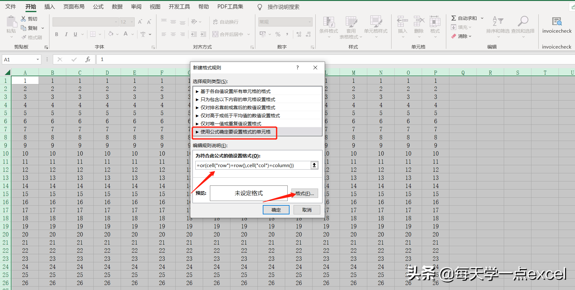 =OR(CELL(“ROW”)=ROW(),CELL(“COL”)=COLUMN()),点击格式选项。