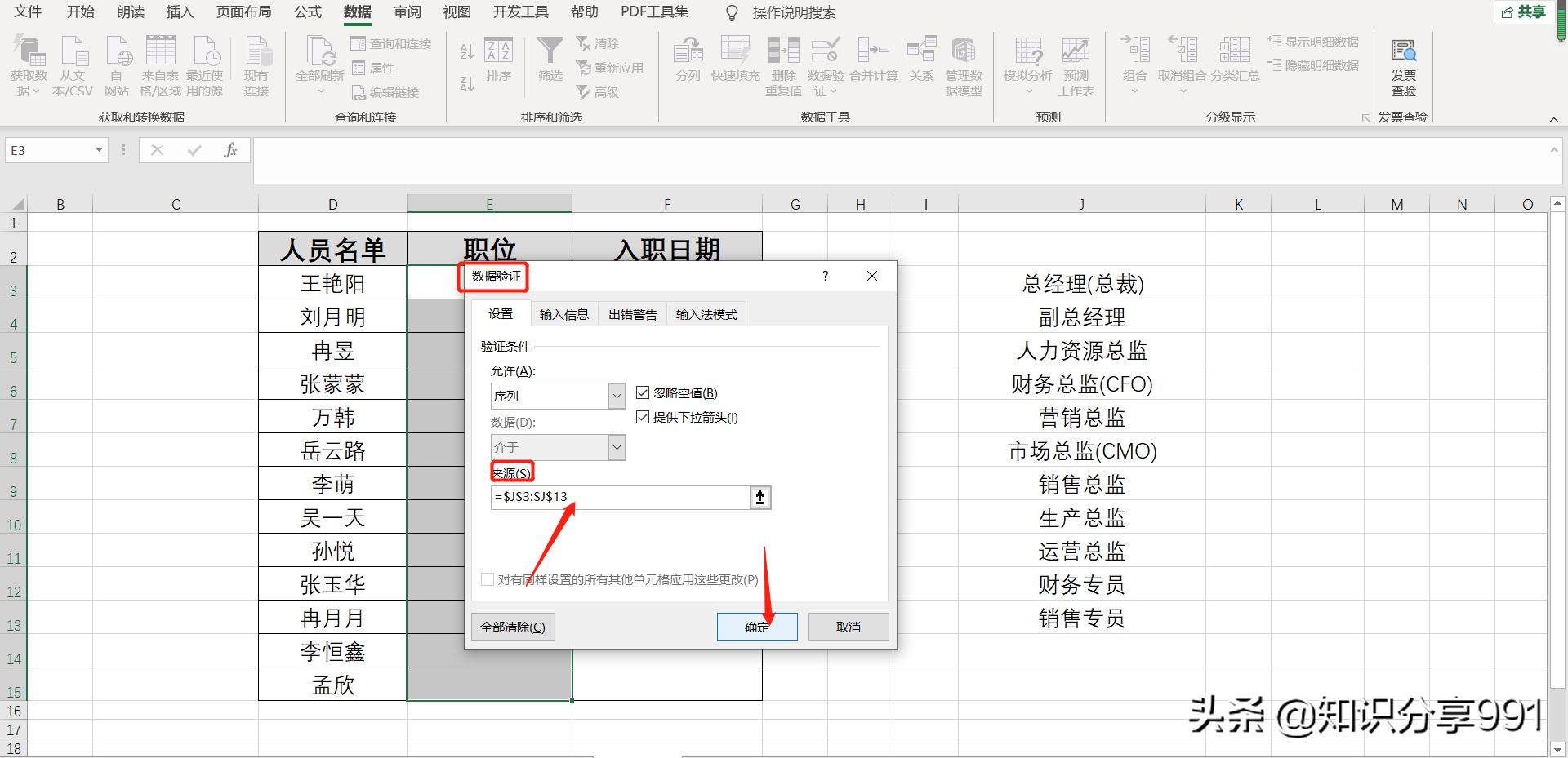 来源里的单元格范围(=$J$3:$J$13)就是职位名单输入的单元格范围(=$J$3:$J$13),确认录入无误后,然后点击下方的确定选项。