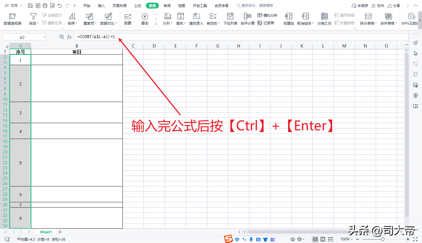 一、先一次性选中需要填充序号的空白单元格二、接着输入公式:=COUNT($A$1:A1) 1