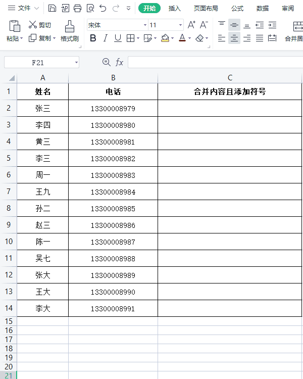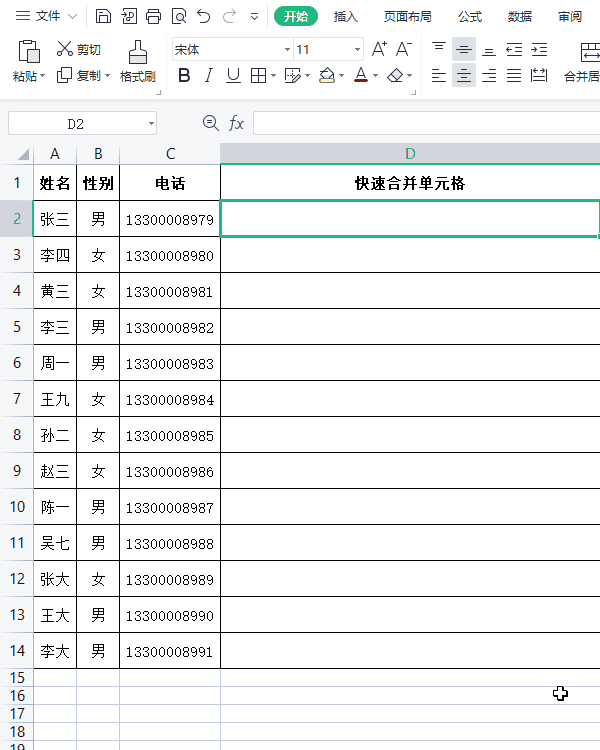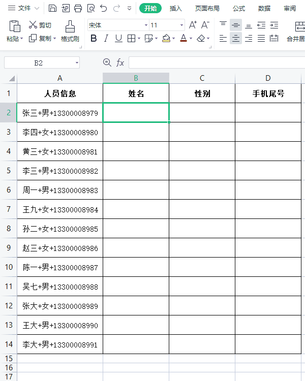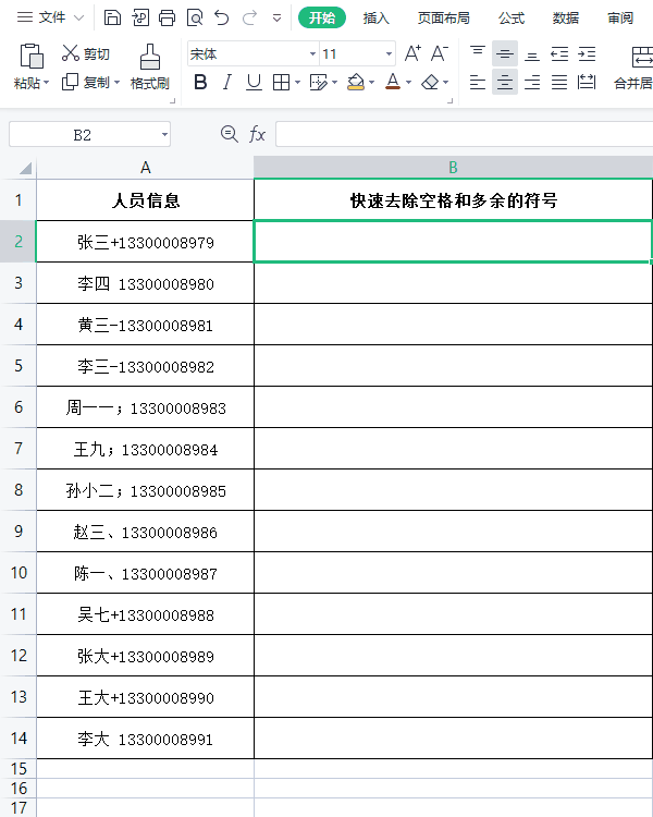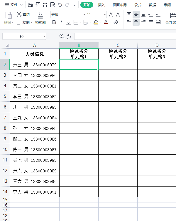 首先,在第一个单元格手动输入一个格式:姓名 电话(根据实际情况来确定,两段数据之间可以是空格连接,或者是其他符号均可,自己多去尝试、多总结);接着选择第一个手动输入好的单元格,按下快捷键【Ctrl E】,软件会自动按照第一个单元格的格式填充。