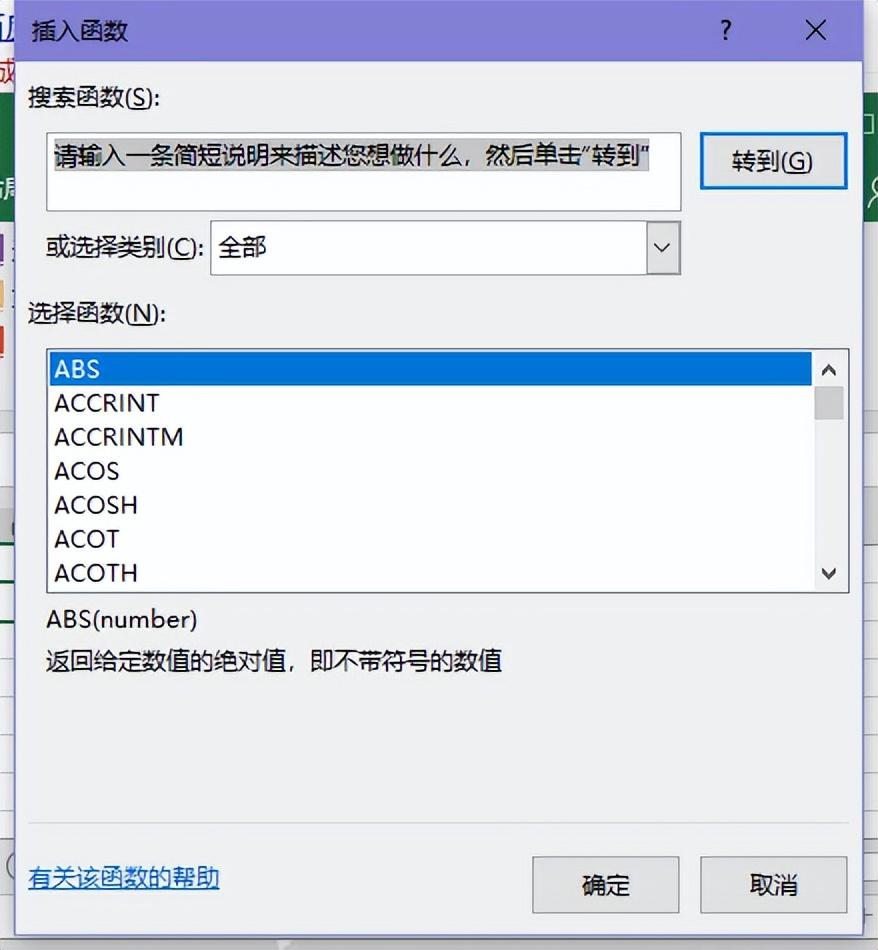 3、在弹出的窗口中,将选择类别改为【全部】,然后再选择函数【ABS】,点击【确定】(ABS:返回定数值的绝对值,即不带符号的数值);