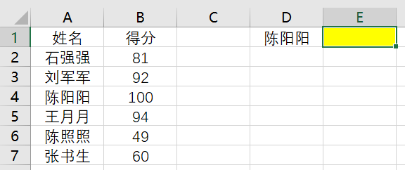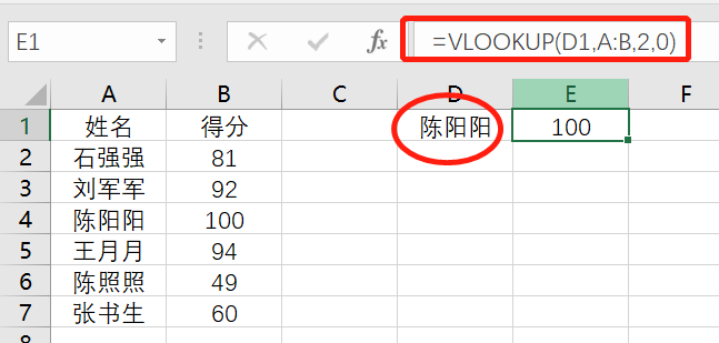 该公式的意思是在A:B列区域找出D1陈阳阳第2列精确匹配的得分值,即为100分。