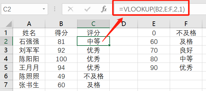 如果使用IF的函数嵌套对学员成绩等级进行评判,那这个公式会相当的复杂,但使用VLOOKUP函数的模糊查询会非常简单