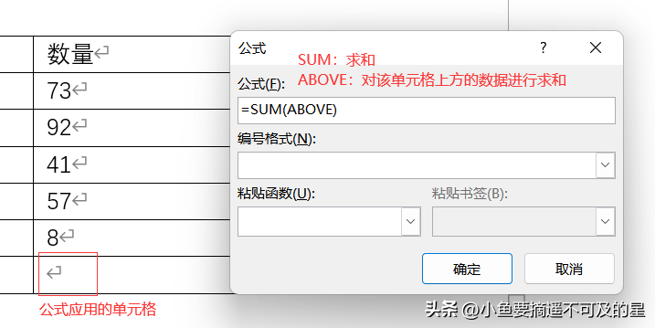 3.弹出的页面默认的公式是=SUM(ABOVE),SUM即“求和”,ABOVE是“上方”,=SUM(ABOVE)即对上方数值进行求和