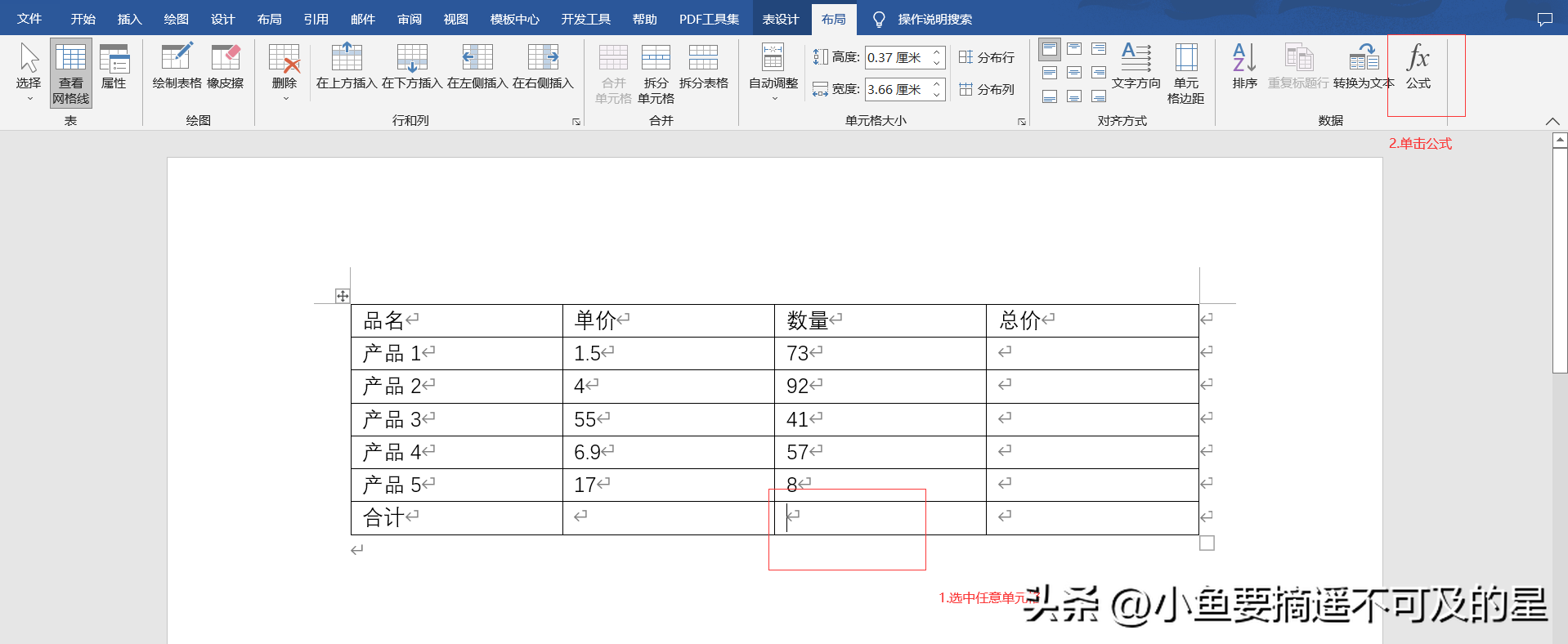 2.选中需要进行统计的单元格后单击“布局”的“公式”